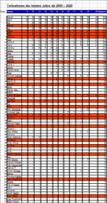 Und hier kommt eine Auflistung der Trainingsteilnahmen seit Beginn der Aufzeichnungen. Jeder, der mind. 10 mal kam, kann sehen, wo er steht und was er in den letzten Jahren geleistet hat.